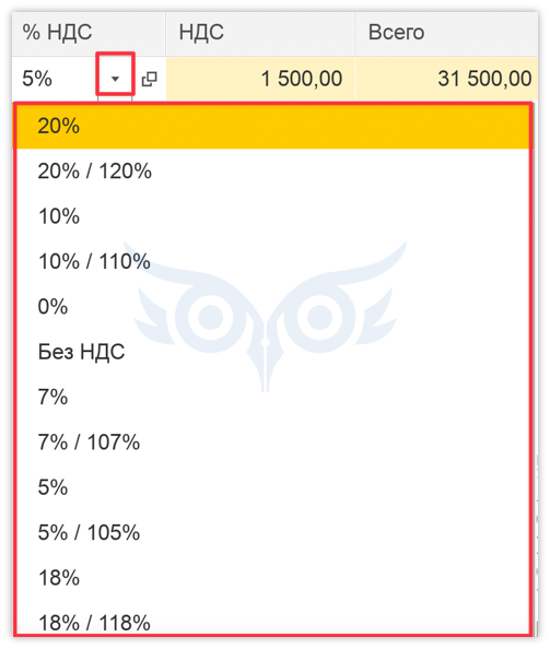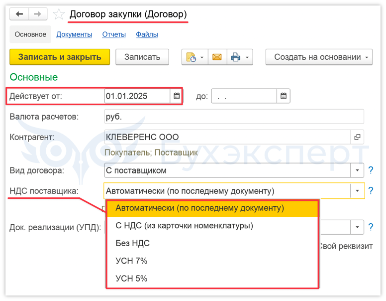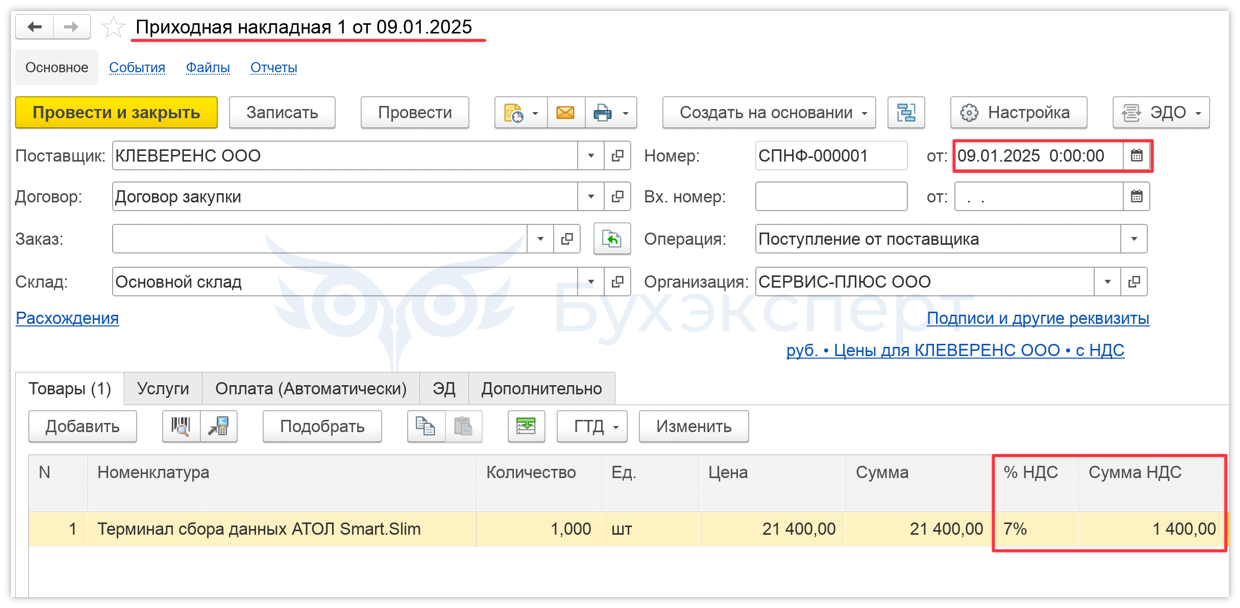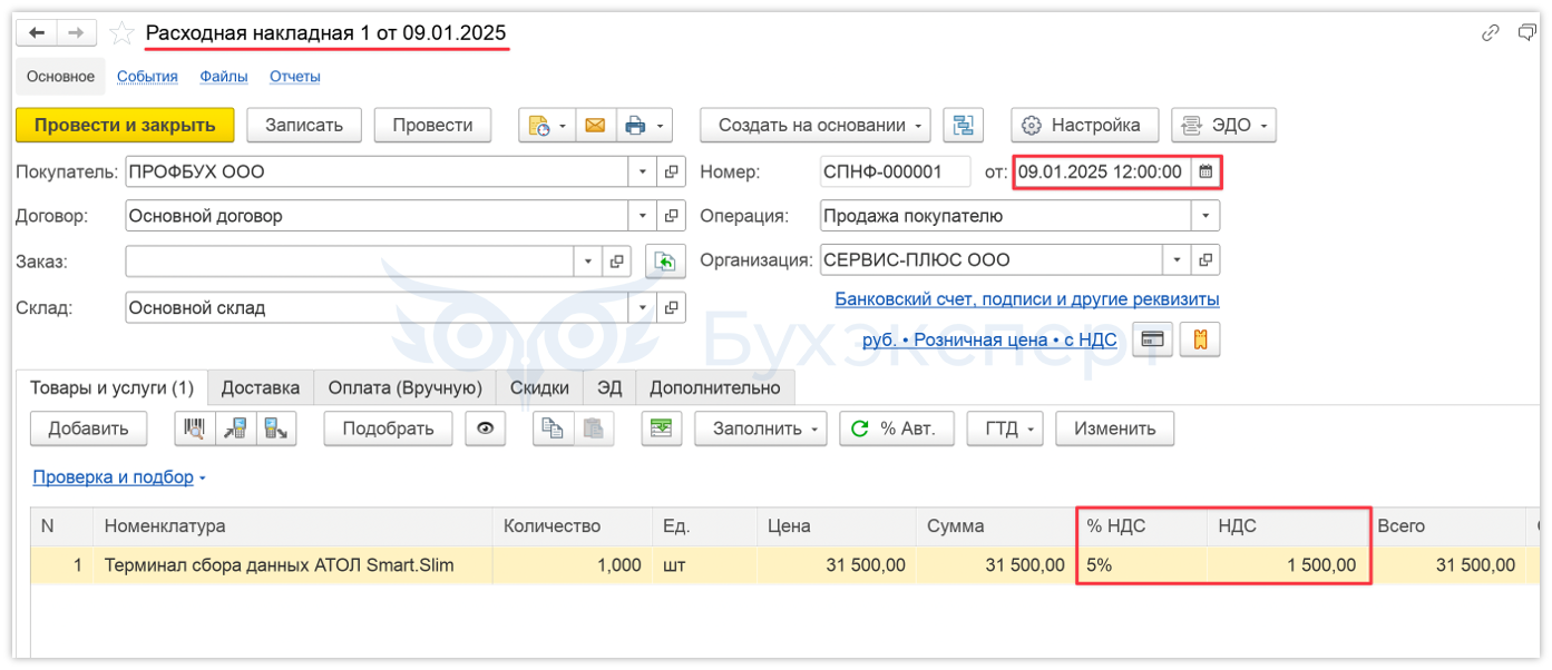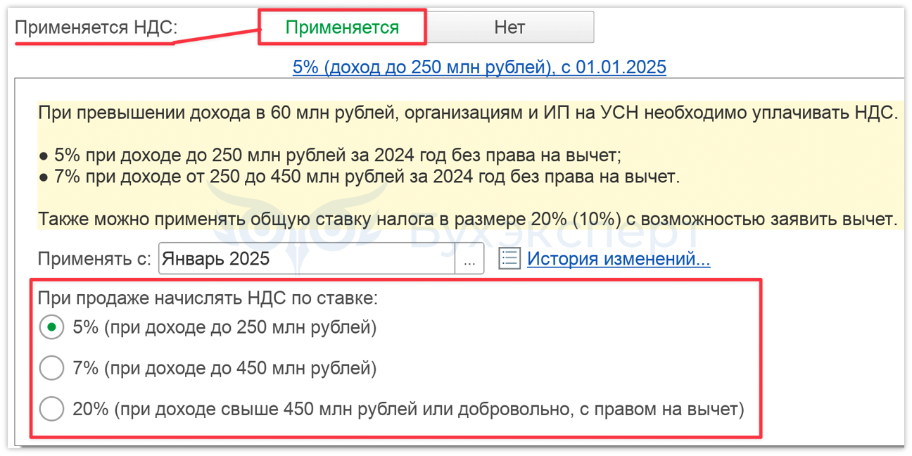 В документах выбрать ставки 5% и 7% возможно с даты документа после 01.01.2025