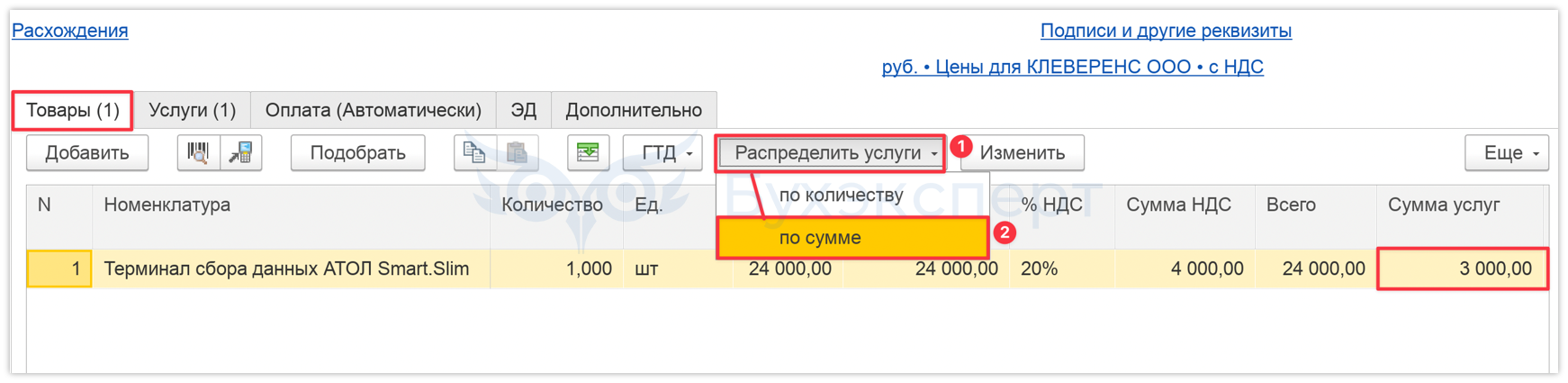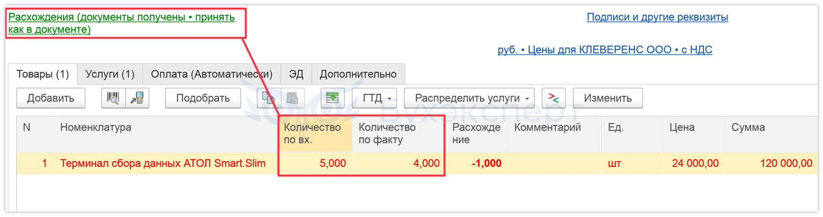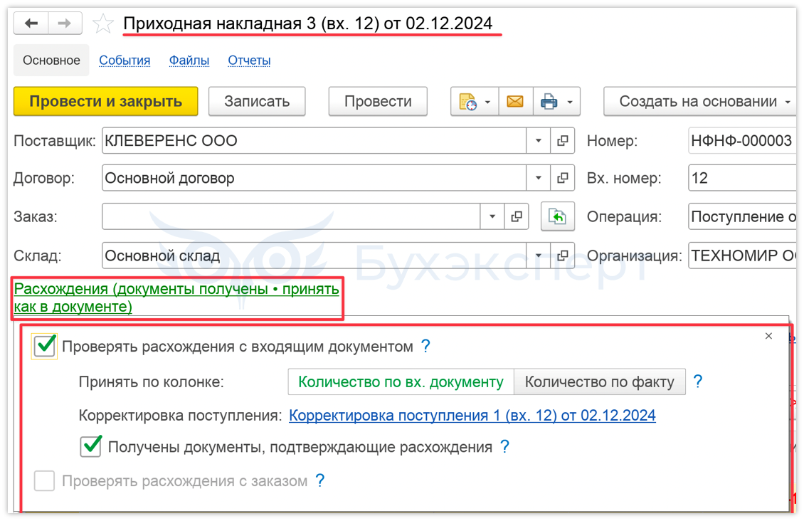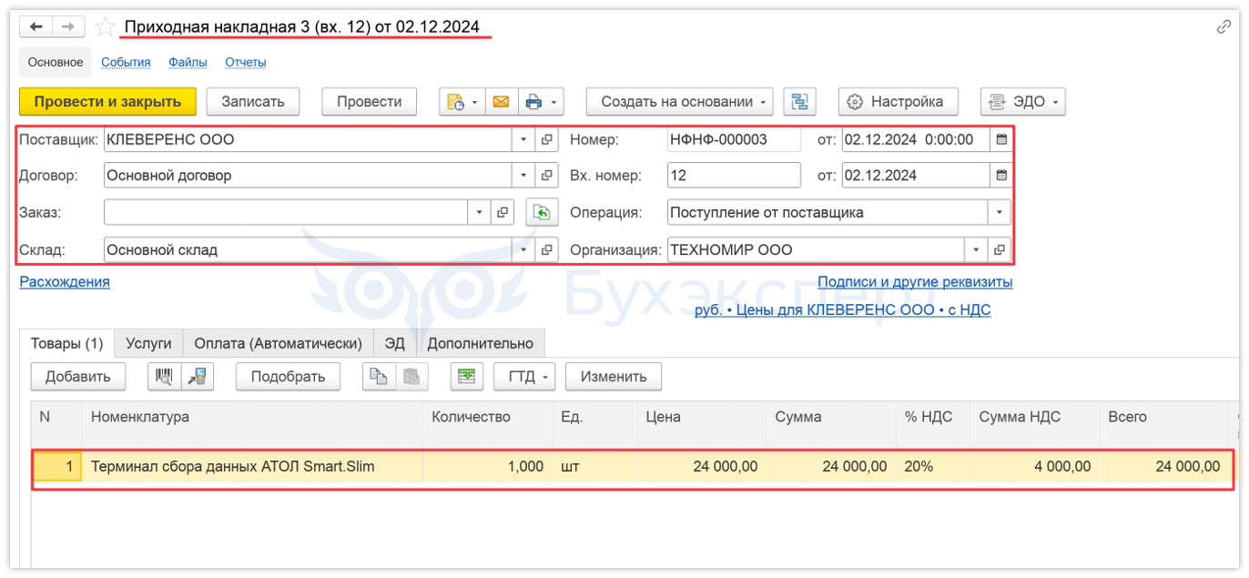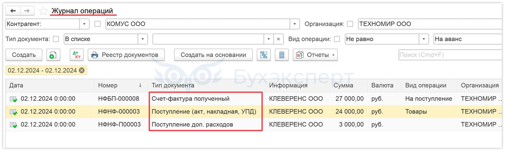 Результат выгрузки документа Приходная накладная (с доп.расходами) в 1С БП