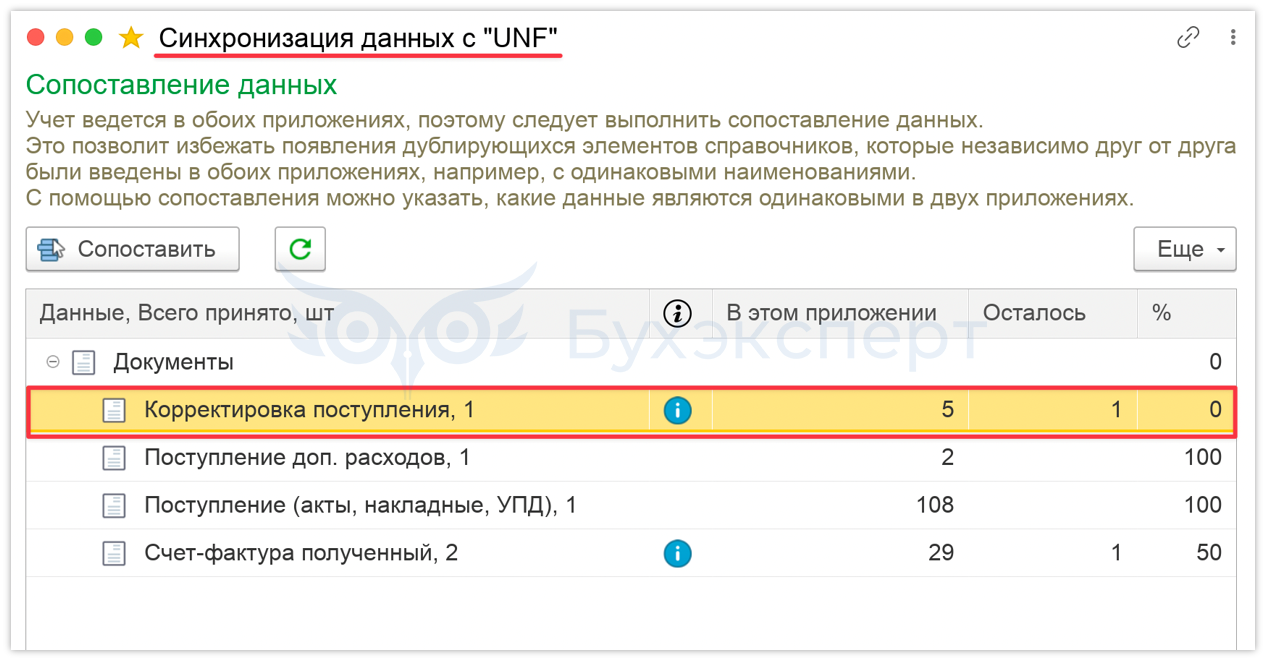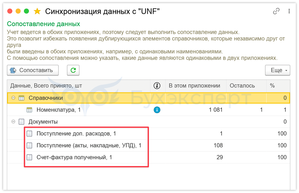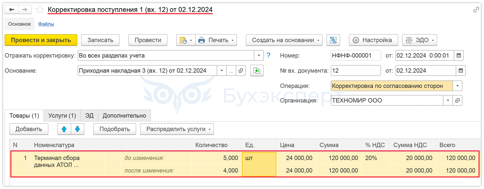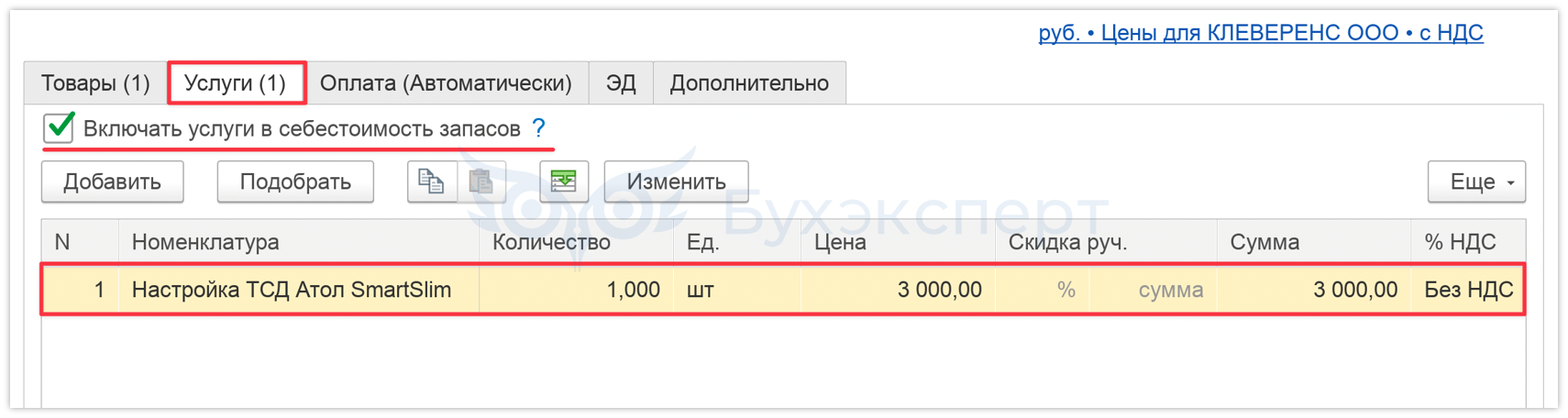 Результат выгрузки документа Приходная накладная (с доп.расходами) в 1С БП