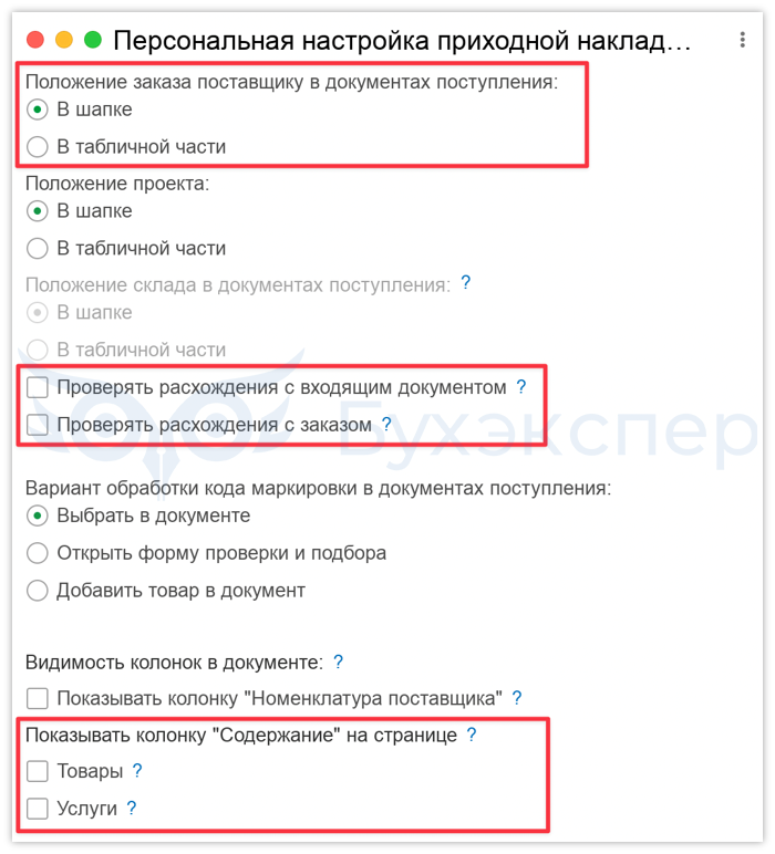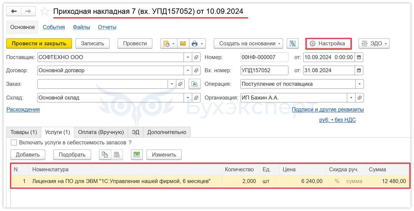Настройки документа Приходная накладная