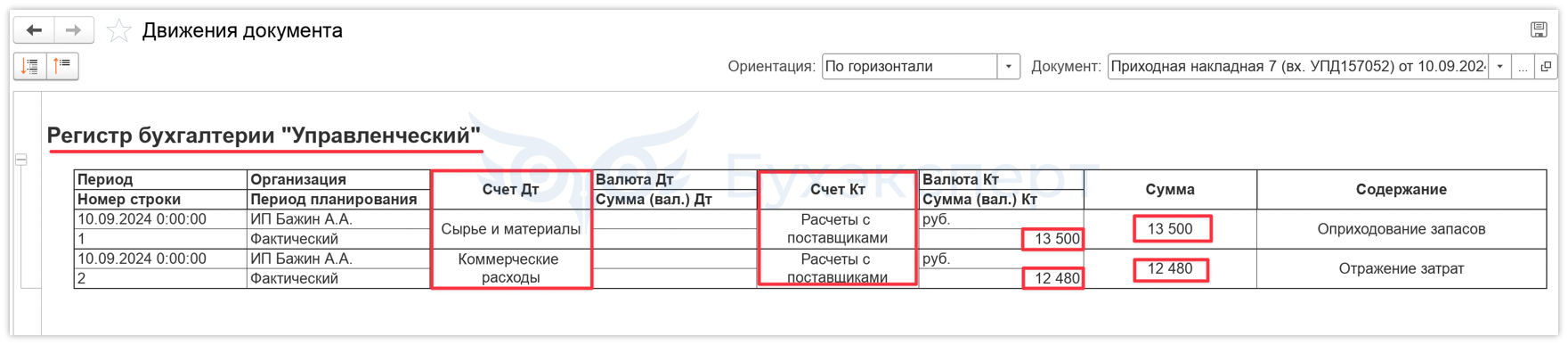 Движения документа Приходная накладная по регистру бухгалтерии Управленческий