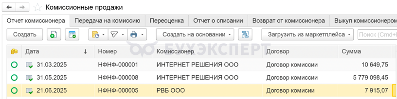 Панель документов по комиссионным продажам (Продажи – Продажи – Комиссионные продажи).