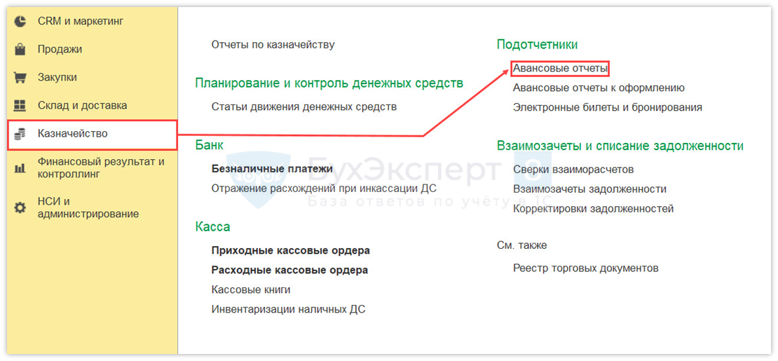 Для начала работы с документом перейдите в меню Казначейство — Авансовые отчеты.