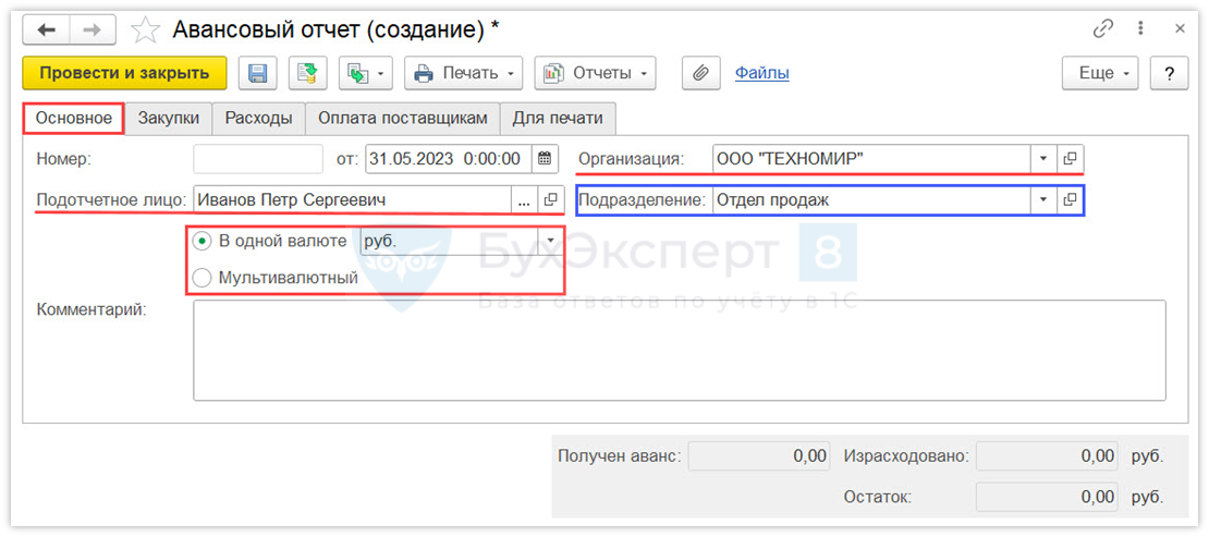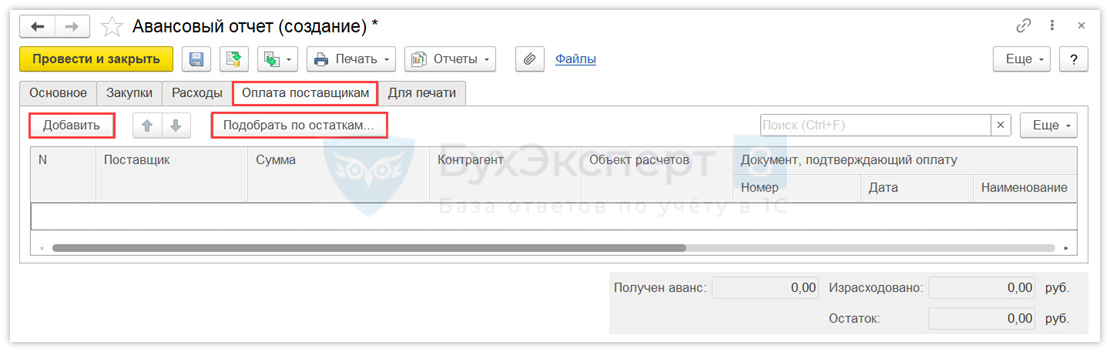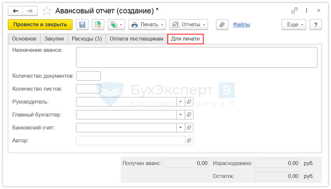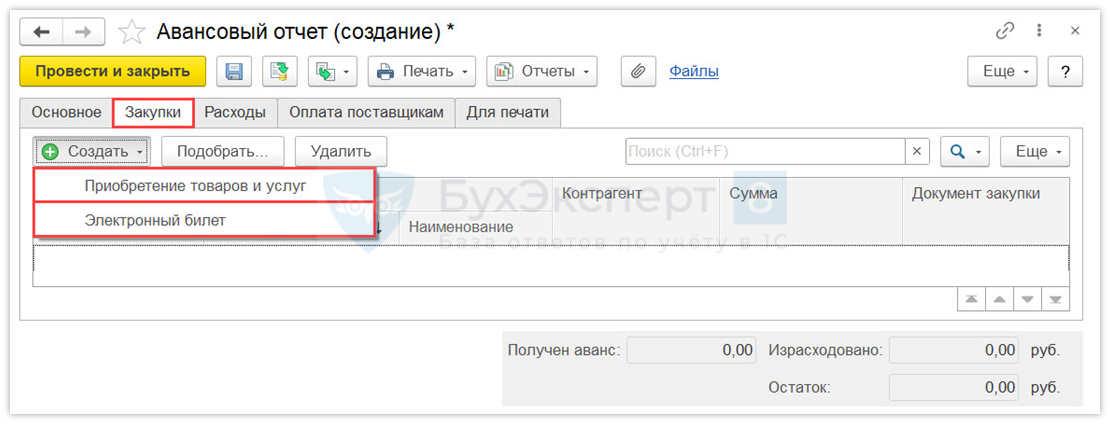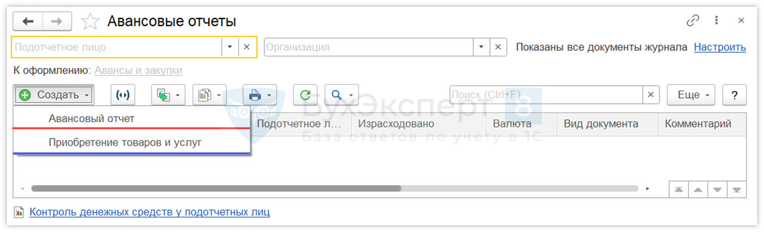 В поле списка Авансовые отчеты создайте документ с типом Авансовый отчет или Приобретение товаров и услуг подотчетным лицом.
