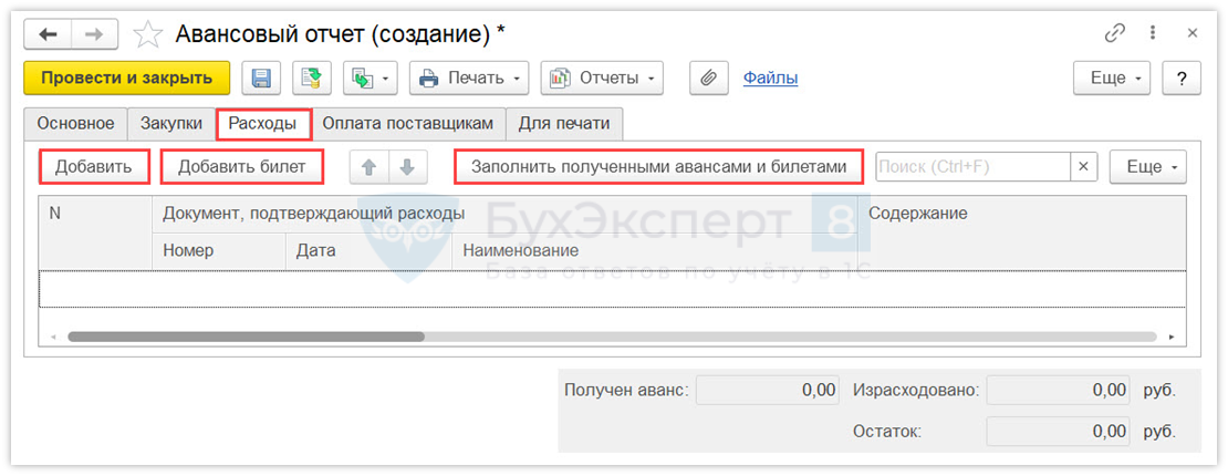 Кнопка Заполнить полученными авансами и билетами перенесет значения в отчет из ранее созданных документов (Расходный кассовый ордер, Списание безналичных денежных средств) по подотчетному лицу и Подразделению, указанному в документах.
