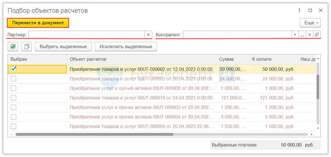 Кнопка Подобрать по остаткам откроет поле выбора Подбор объектов расчетов. Это позволит выбрать из документов объект расчета и перенести данные в Авансовый отчет. Для быстрого поиска воспользуйтесь сотрировкой по Партнеру или Контрагенту.