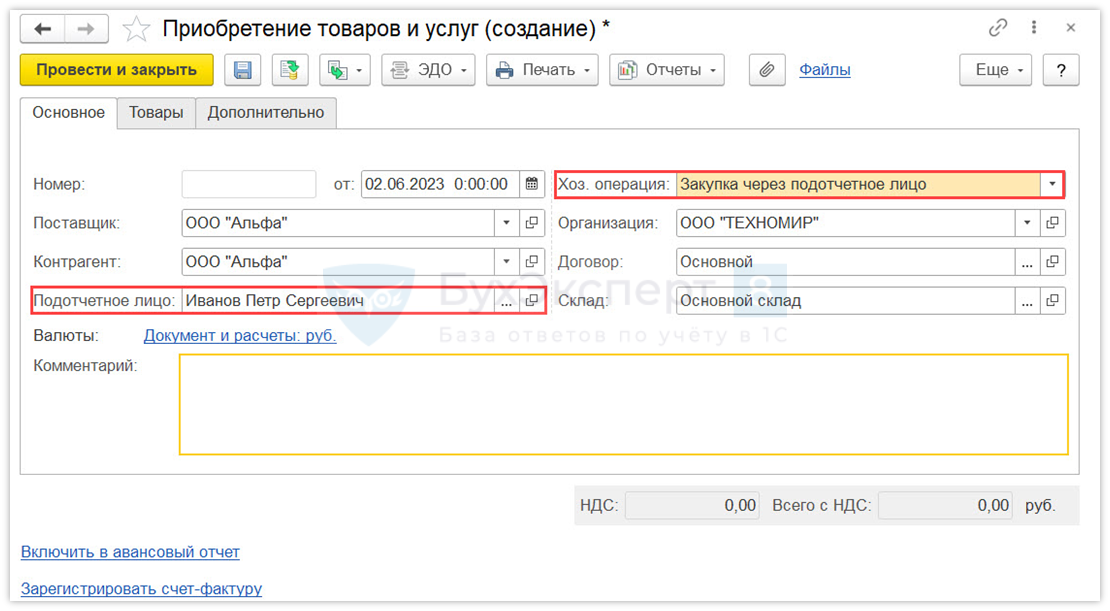 Закупка товаров или услуг подотчетным лицом регистрируется документом Приобретение товаров и услуг с видом хозяйственной операции Закупка через подотчетное лицо. У него схожая структура с документом Приобретение товаров и услуг с видом хозяйственной операции Закупка у поставщика, но имеется реквизит Подотчетное лицо. После регистрации документ должен быть включен в Авансовый отчет.