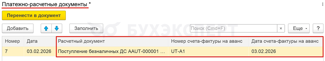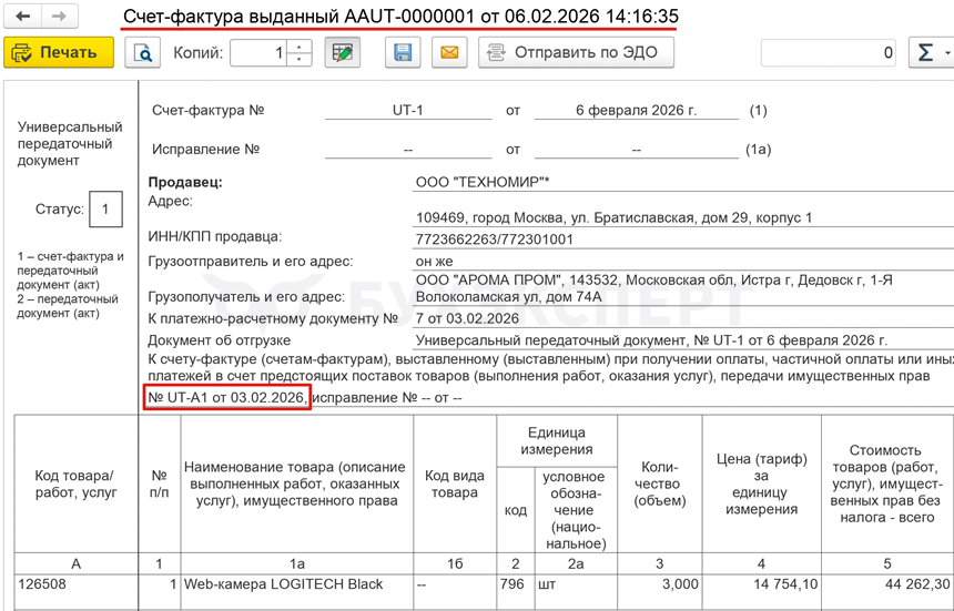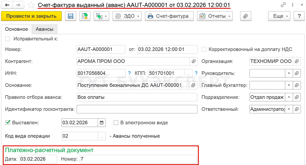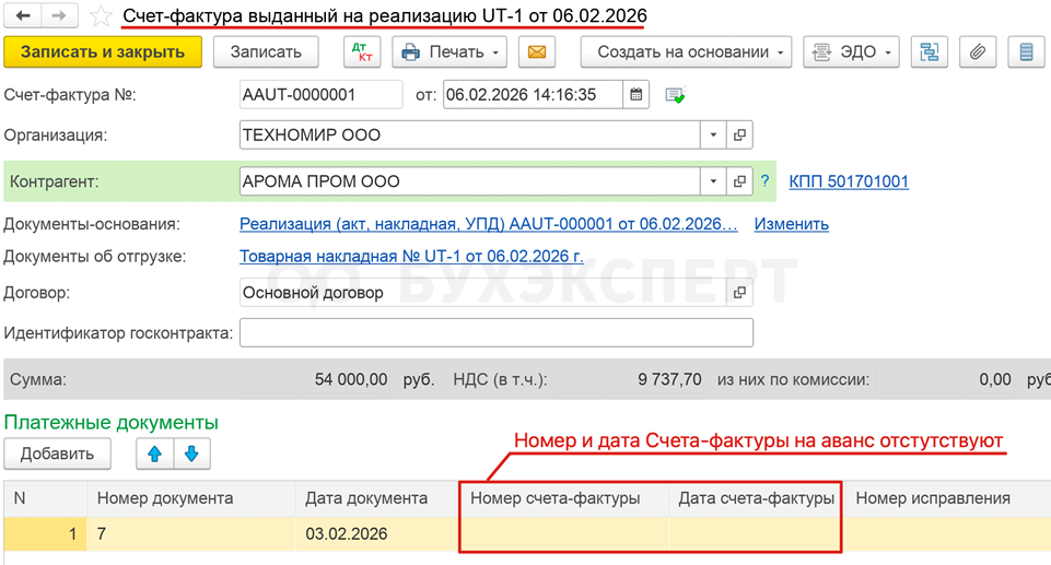 После синхронизации УТ-БП в документе Счет-фактура выданный на реализацию на стороне БП отсутствуют данные по номеру и дате счета-фактуры на аванс. Заполните строку 5б вручную.