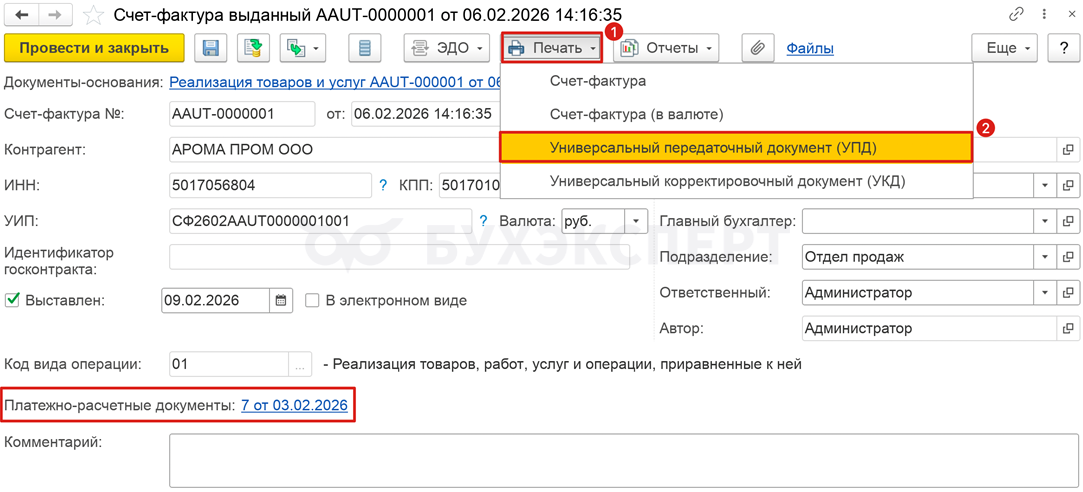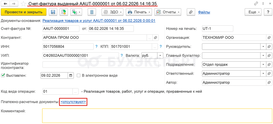 В УТ на основании документа реализации введите документ Счет-фактура выданный и укажите ссылку на платежно-расчетный документ.