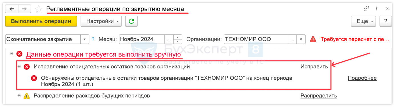 При выполнении закрытия месяца программа предупредит об отрицательных остатках