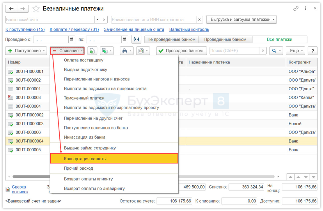 Перейдите в раздел Казначейство – Безналичные платежи, оформите Списание с типом операции Конвертация валюты.