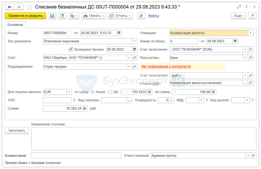 Заполните документ Списание безналичных ДС. В поле Счет зачисления укажите валютный счет, в поле Счет — счет списания, заполните Статью ДДС.