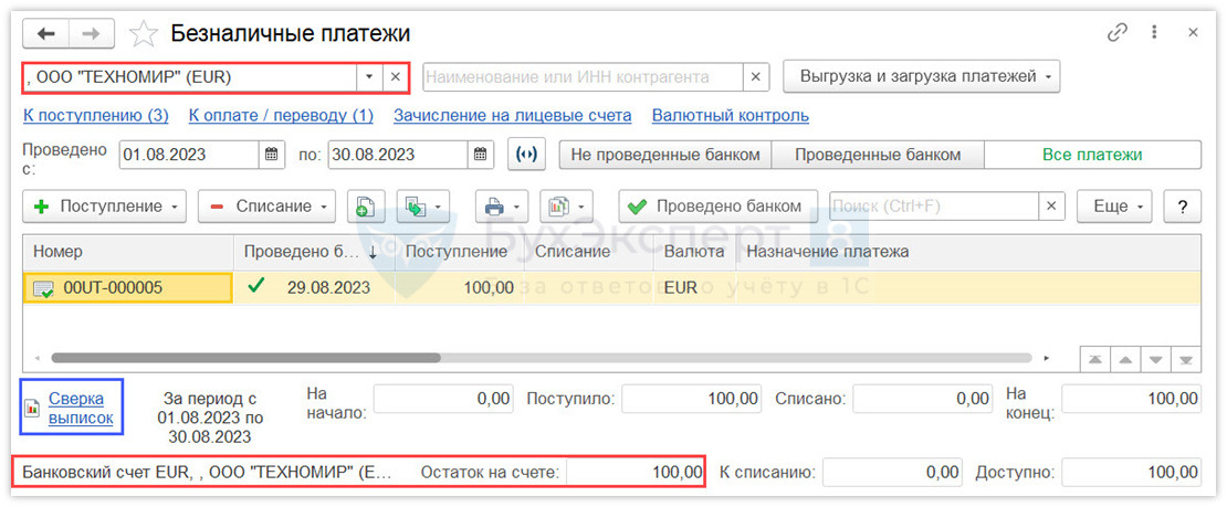 Остаток по счету на конец дня можно увидеть в форме списка Безналичные платежи, установив отбор.