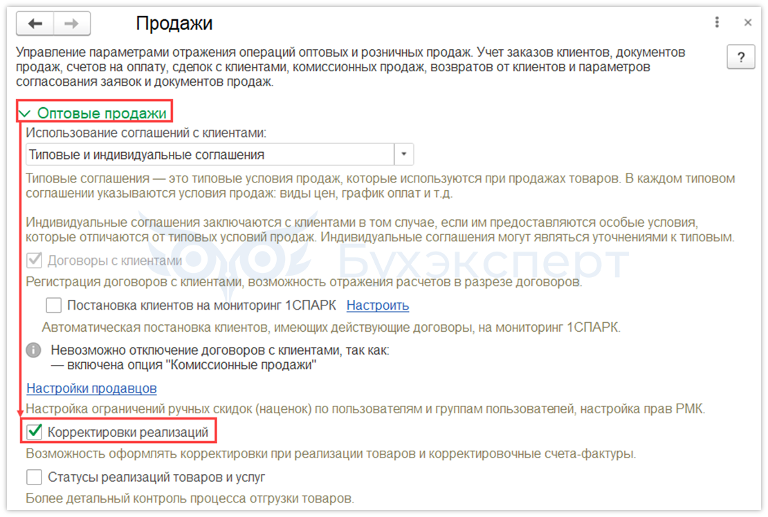 Перейдите в раздел НСИ и администрирование – Продажи – Оптовые продажи и установите флажок Корректировки реализаций.