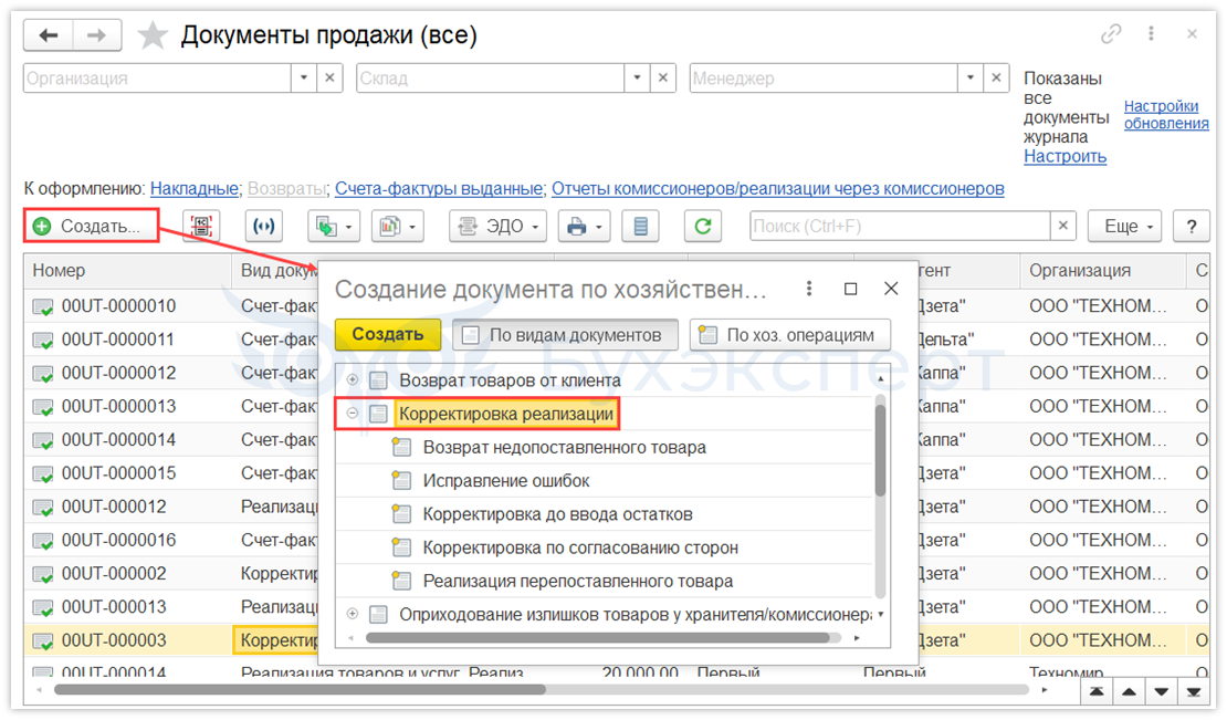 Если Корректировка реализации осуществляется организацией, использующей ордерную схему документооборота, то варианты отражения: