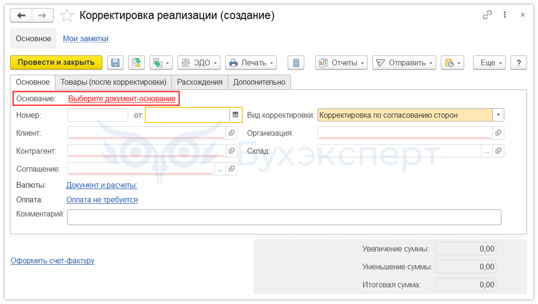 После выбор документа все поля на вкладке Основное заполнятся по данным документа-основания.