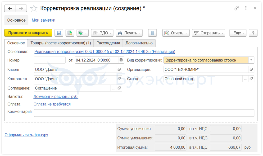 Корректировка реализации по согласованию сторон в 1С УТ 11.5