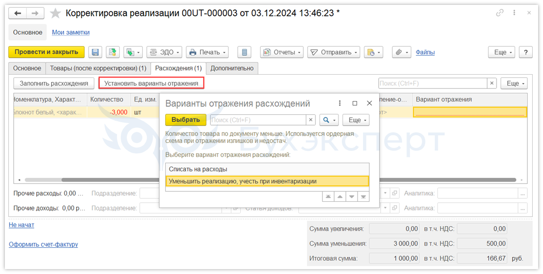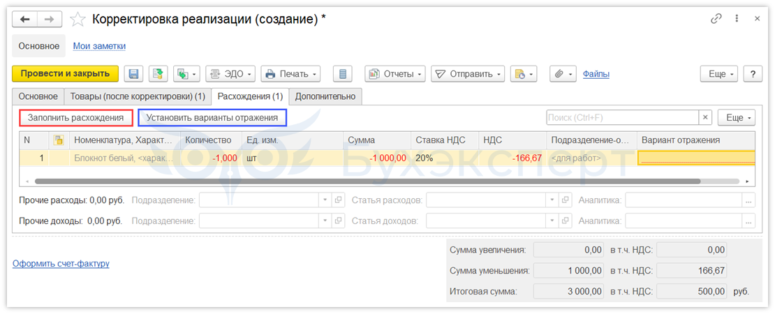 На вкладке Расхождения нажмите кнопку Заполнить расхождения. Если корректировка касается количества товаров, дополнительно нажмите кнопку Установить варианты отражения.