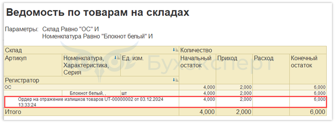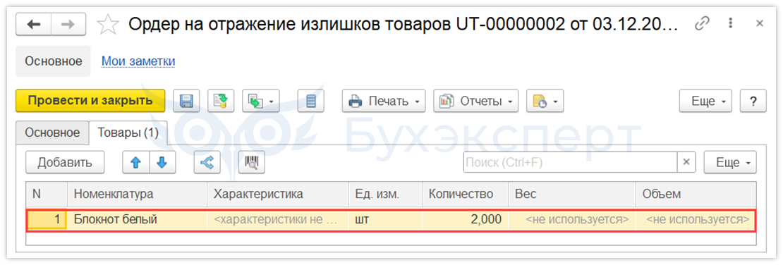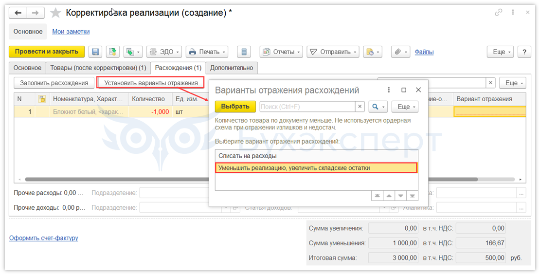 При выборе варианта Списать на расходы товар будет списан и движения по складу не будет отражено. При выборе варианта Уменьшить реализацию, учесть при инвентаризации для регистрации движения товара по складу организации нужно создать документ Ордер на отражение излишков товара.