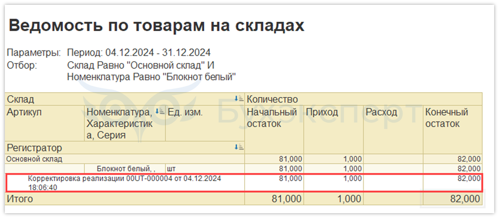 При выборе варианта Списать на расходы товар будет списан и движения по складу не будет отражено. При выборе варинта Уменьшить реализацию, увеличить складские остатки, движения по складу можно отследить при помощи отчета Ведомость по товарам на складах.