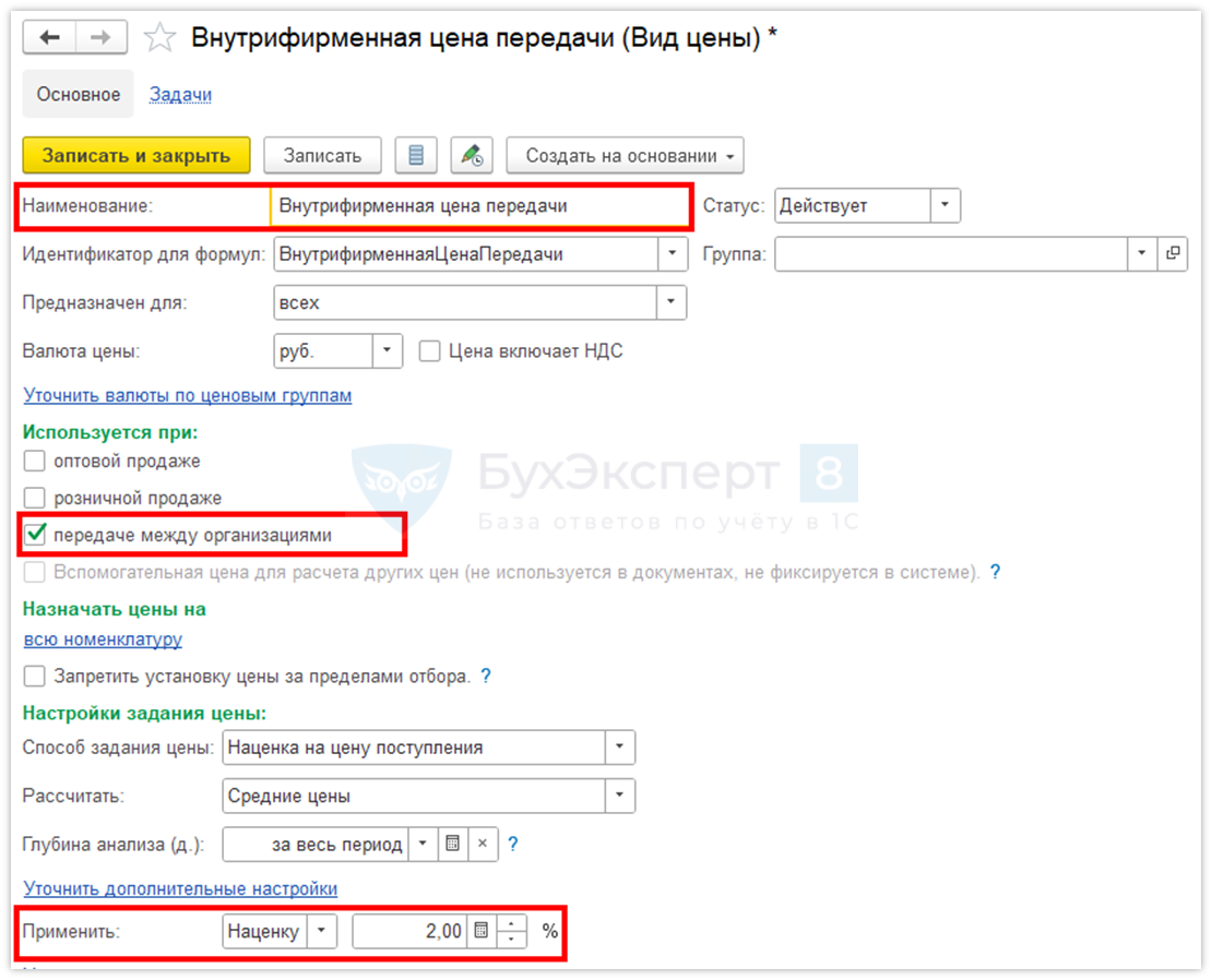 Настройте справочник Вид цены для межфирменных продаж. Для этого перейдите в CRM и маркетинг – Настройки и справочники – Виды цен – Создать. Установите настройки:
