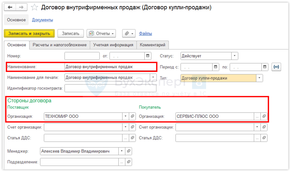 Настройте справочник Договор для межфирменных продаж. Установите наименование — договор внутрифирменных продаж, выберите организацию-поставщика и организацию-покупателя.