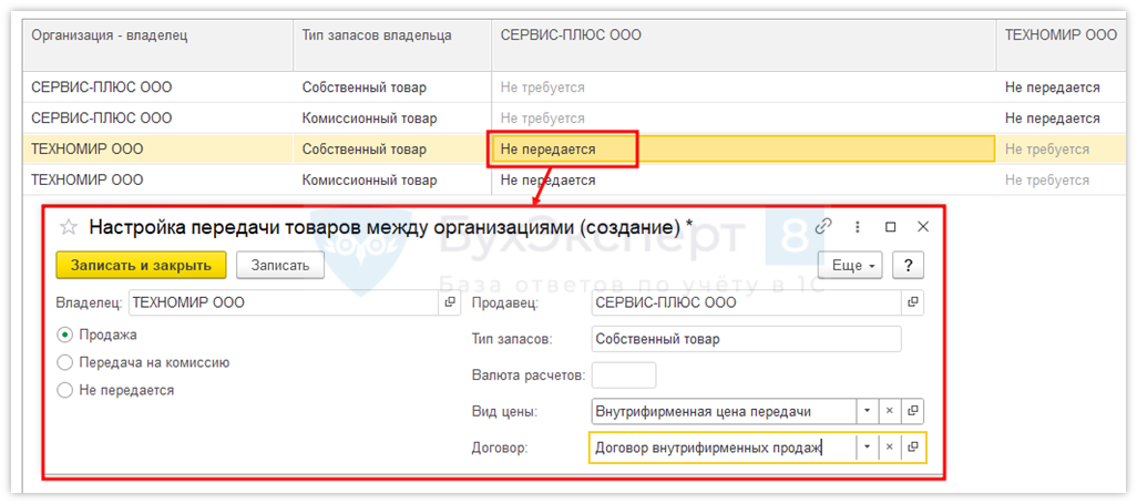 Откройте настройку передачи товаров между организациями и выберите пункт Продажа. Затем установите Вид цены – Внутрифирменная цена передачи и Договор — Договор внутрифирменных продаж. Сохраните изменения.