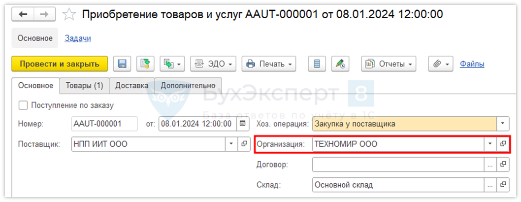 Создайте документ Приобретение товаров и услуг на организацию-покупателя (ТЕХНОМИР ООО).