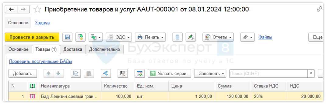 Заполните табличную часть Товары. Стоимость закупки единицы товара — 1 200 руб.