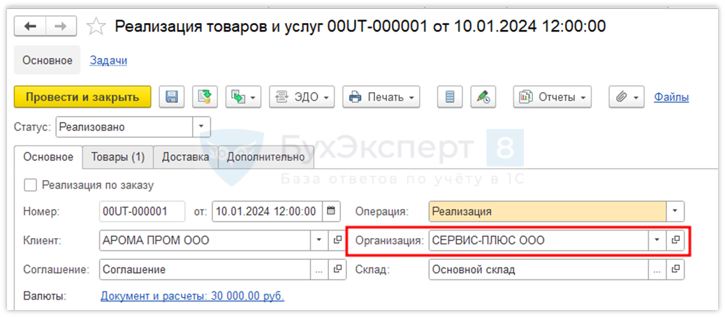 Создайте документ Реализация товаров и услуг от имени другой организации (СЕРВИС-ПЛЮС ООО).