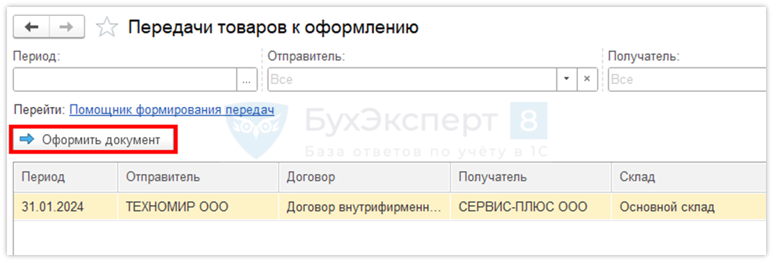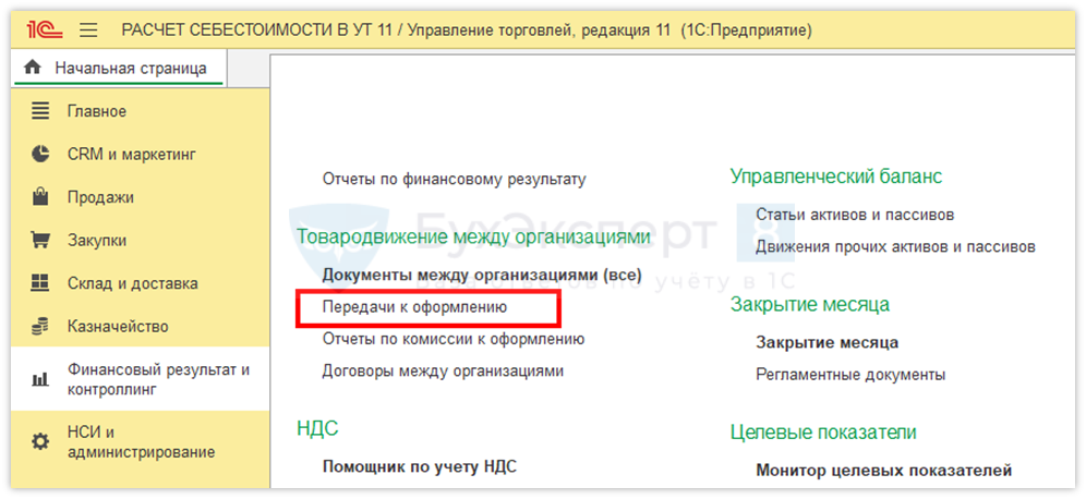Перейдите в Финансовый результат и контроллинг – Товародвижение между организациями – Передачи к оформлению.