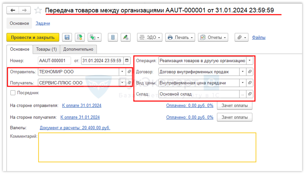 Автоматически сформируется документ Передача товаров между организациями с заполненными полями.