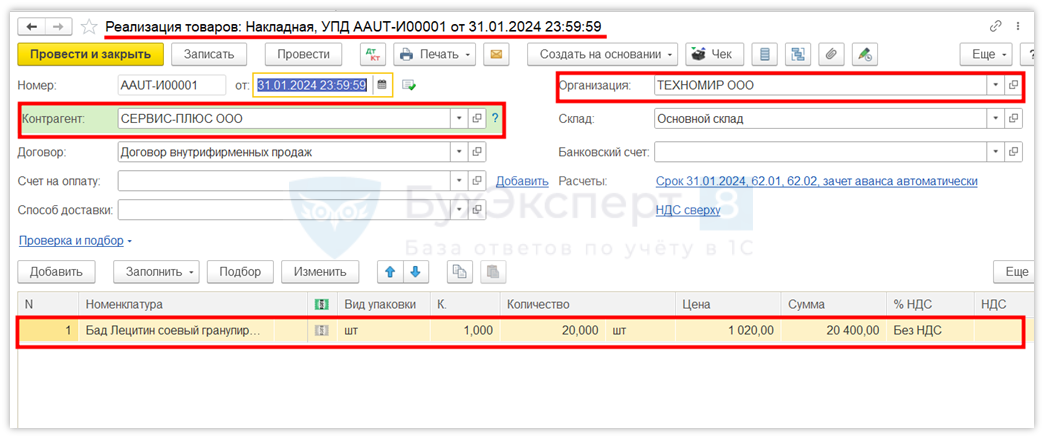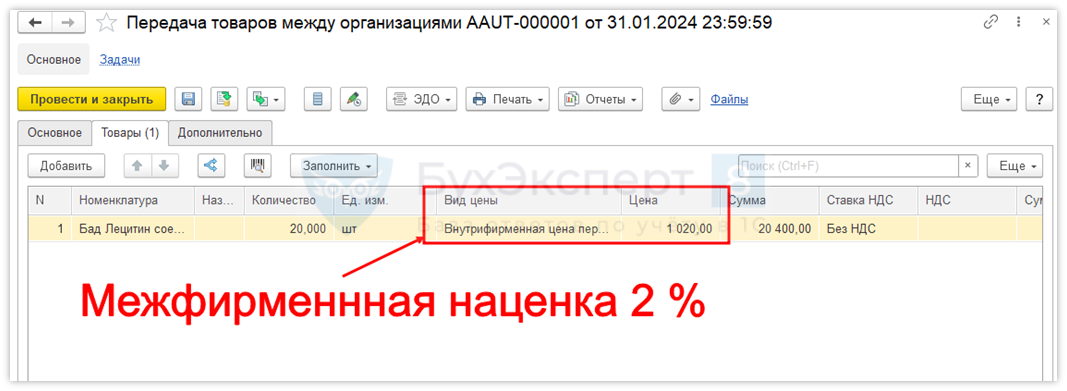 Документ Передача товаров между организациями в 1С БП преобразуется в Реализация товаров: Накладная, УПД. В табличной части Товары отобразится номенклатура с ценой передачи (наценка 2%).