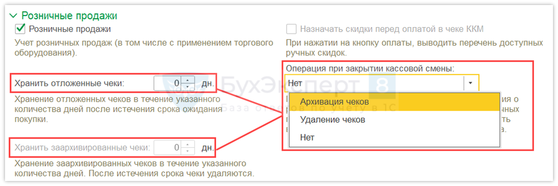 - архивация чеков — документы Чеки будут помещены в архив после окончания кассовой смены;