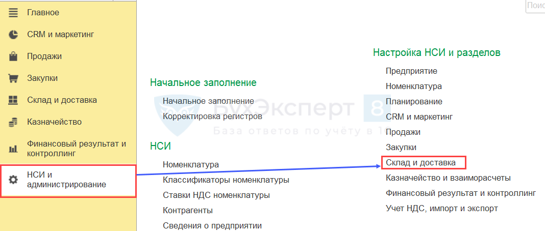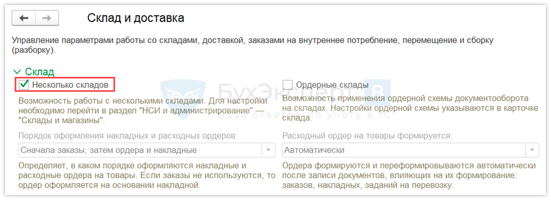 Перейдите в раздел НСИ и администрирование — Склад и доставка, раскройте группу Склад и установите флажок Несколько складов.