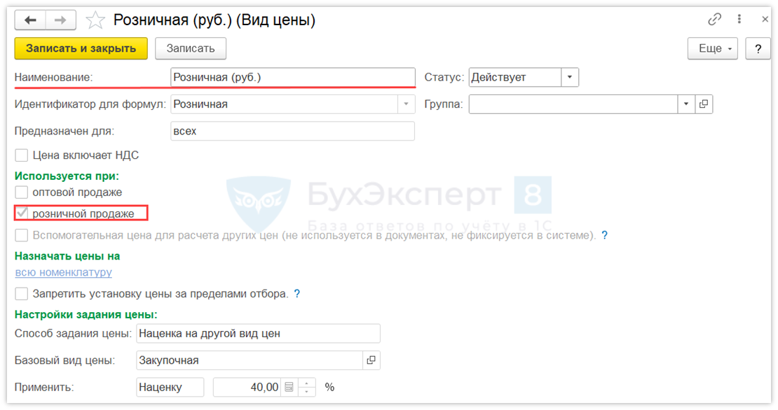 Для установки розничных цен необходимо создать Вид цен – Розничная. Подробнее о настройке ценообразования Настройка ценообразования: виды цен в 1С УТ 11.5.
