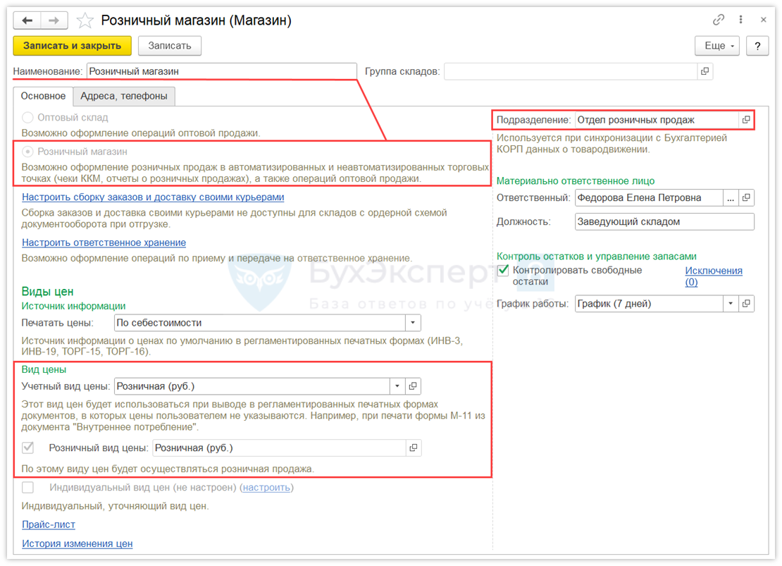 После настройки справочников Виды цен и Структура предприятия внесите изменения в настройку Розничного магазина.