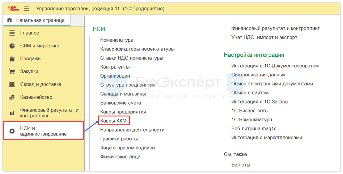 В разделе НСИ и администрирование — Кассы ККМ создайте элемент справочника Кассы ККМ (для каждого кассового аппарата — отдельный элемент).