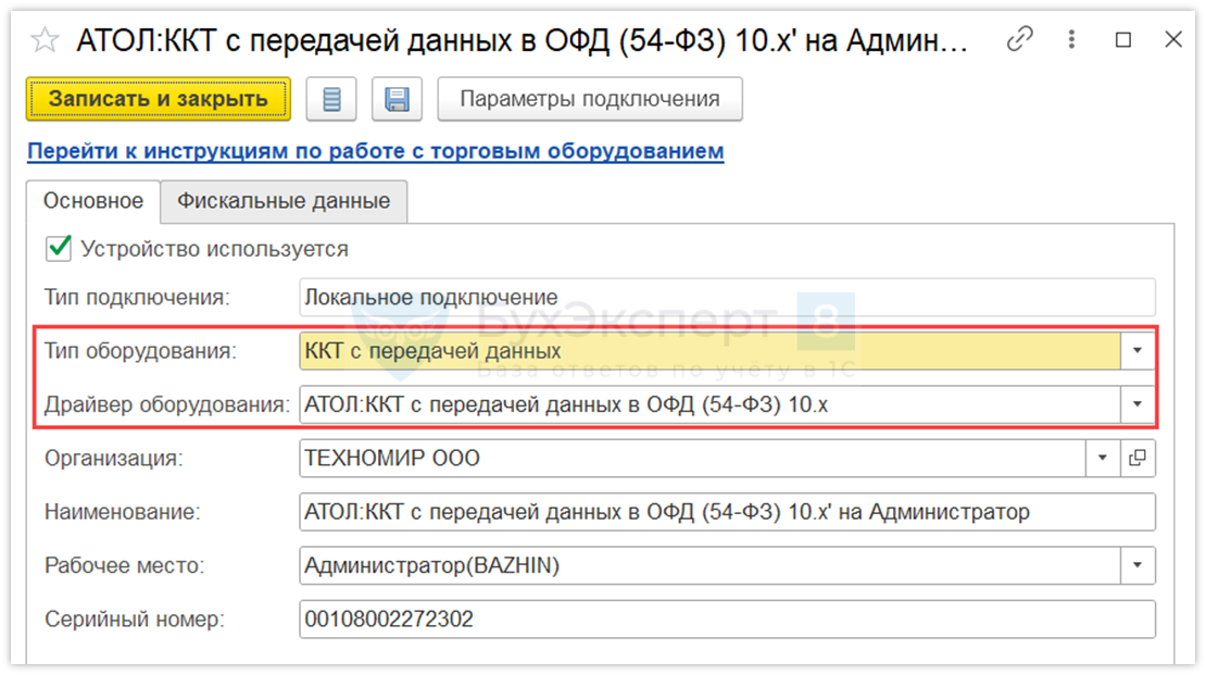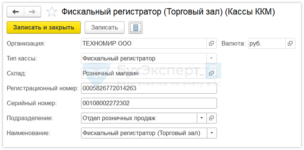 Заполните параметры справочника Кассы ККМ и сохраните изменения.