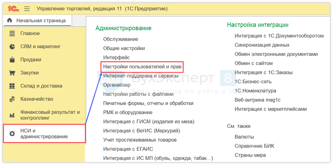 Для настройки прав кассира перейдите в раздел НСИ и администрирование — Настройки пользователей и прав.