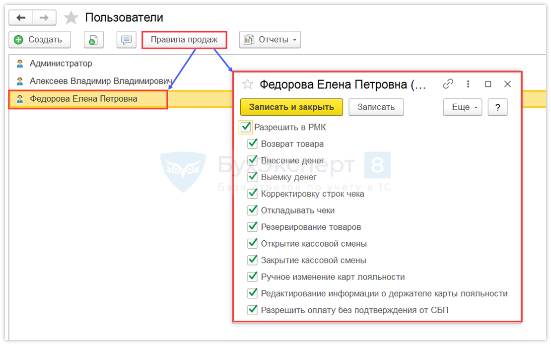 Выберите в списке пользователя, ответственного за розничные продажи, и нажмите кнопку Правила продаж. Отметьте доступные права для пользователя в Рабочем месте кассира.