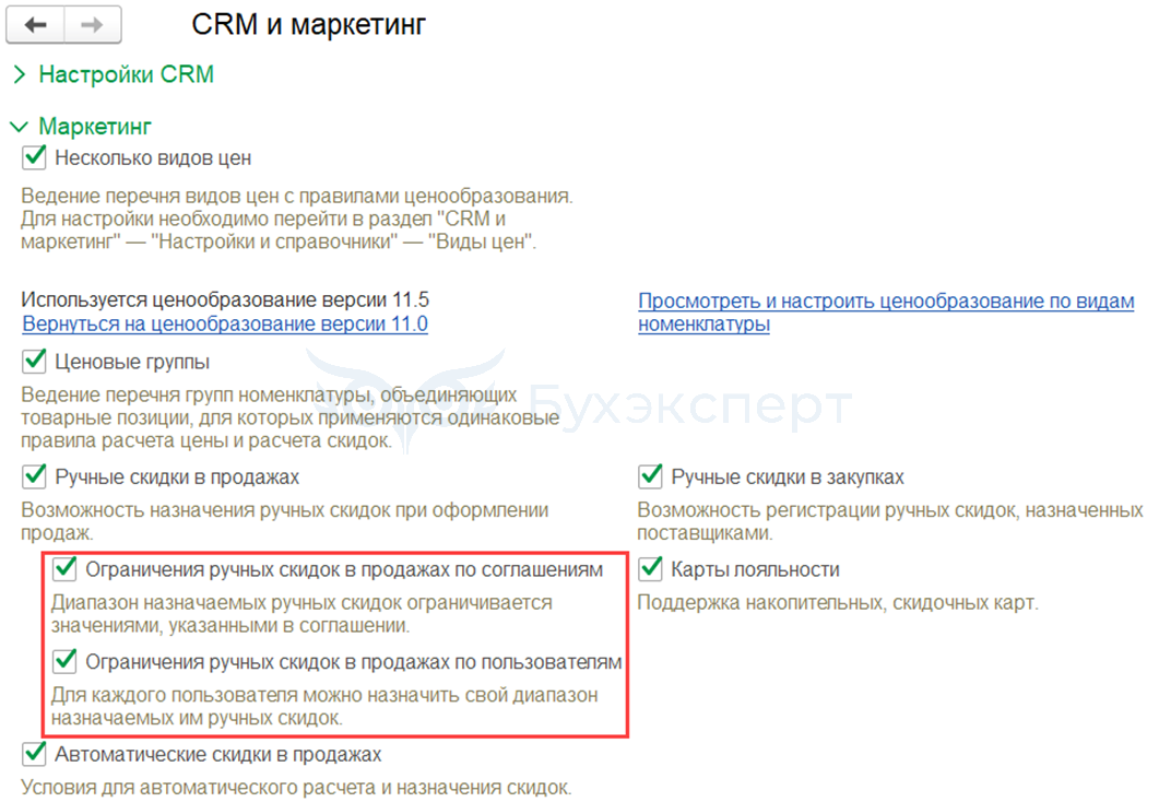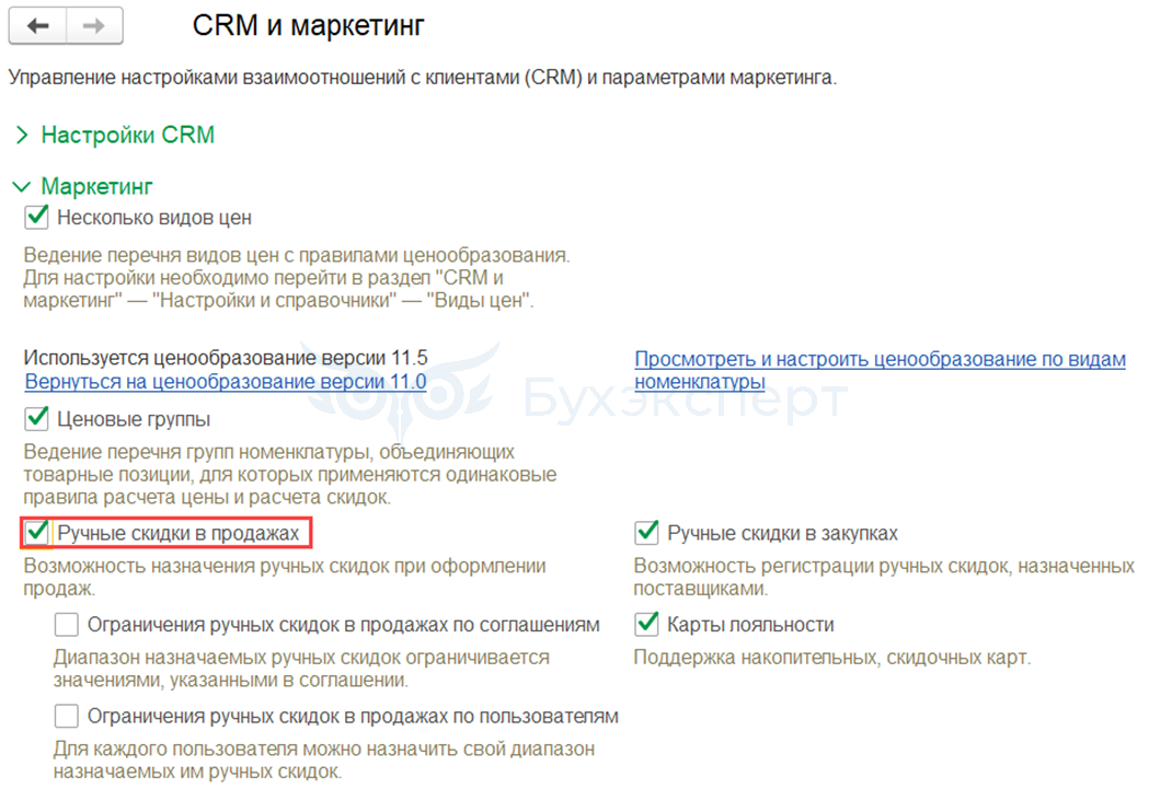 Перейдите в раздел НСИ и администрирование — CRM и маркетинг — Маркетинг и установите флажок Ручные скидки в продажах.