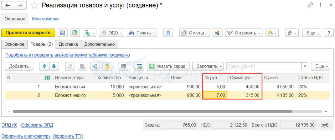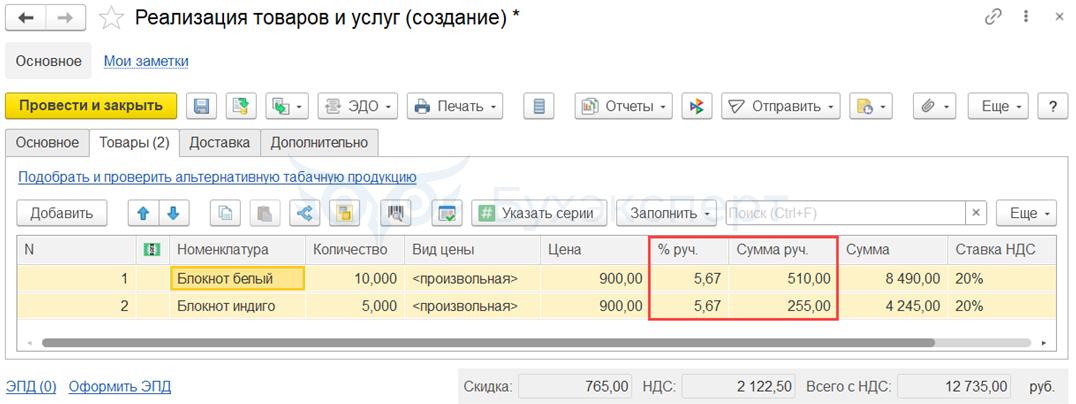 Перейдите в раздел Продажи – Документы продажи (все) и нажмите кнопку Создать. При заполнении документа Реализация товаров и услуг на вкладке Товары доступны для редактирования поля %руч. и Сумма руч.