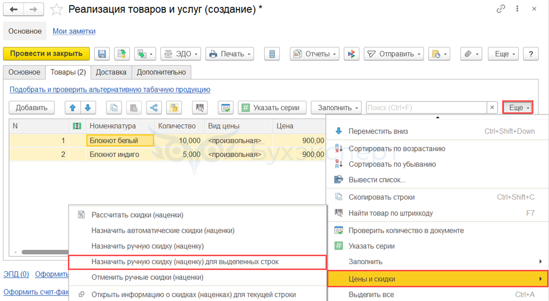 Установить можно как процент, так и сумму скидки. Если нужно установить ручные скидки для нескольких позиций, выделите их, удерживая клавишу Ctrl, а затем перейдите Еще – Цены и скидки – Назначить ручную скидку (наценку) для выделенных срок.