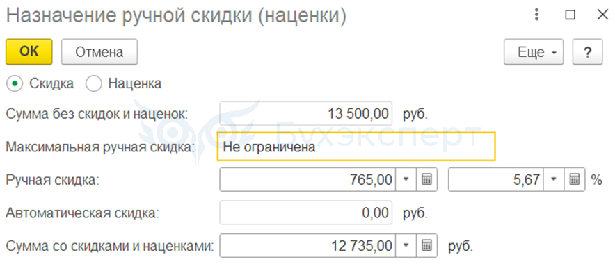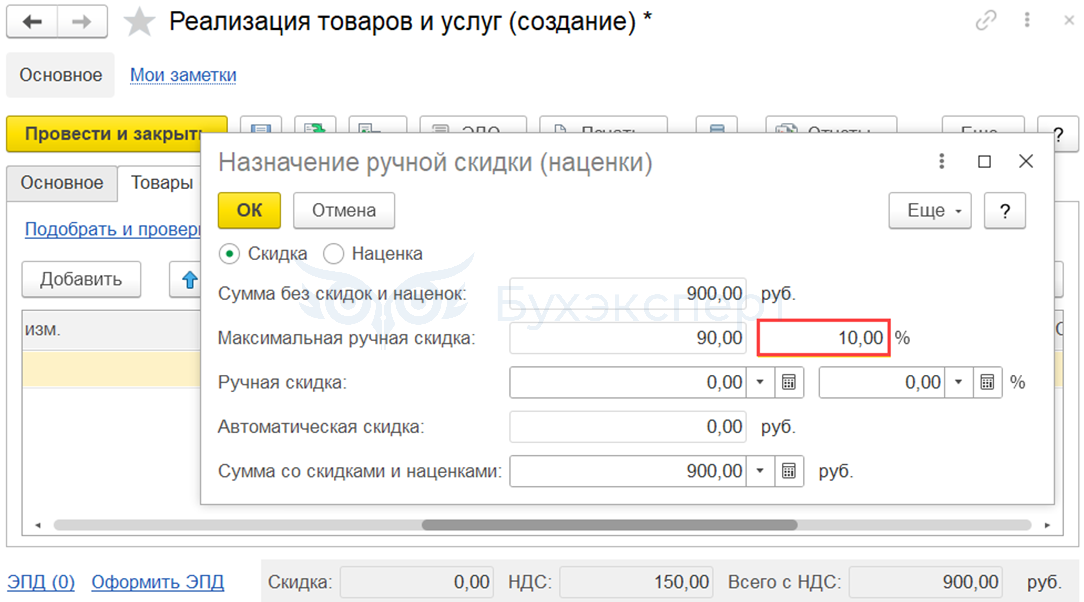 Если в Соглашении с клиентом и в Правилах продаж для пользователя установлены разные значения Максимальной ручной скидки (наценки) в документе Реализация товаров и услуг, сработает меньшая.