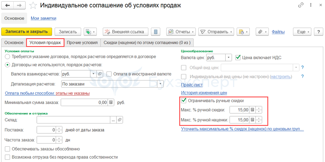 Ограничения ручных скидок в продажах по соглашениям можно установить для каждого соглашения индивидуально, даже для одного клиента. Перейдите в раздел Продажи – Индивидуальные соглашения с клиентом. На вкладке Условия продаж поставьте флажок Ограничивать ручные скидки и установите максимальные значения для скидок (наценок).