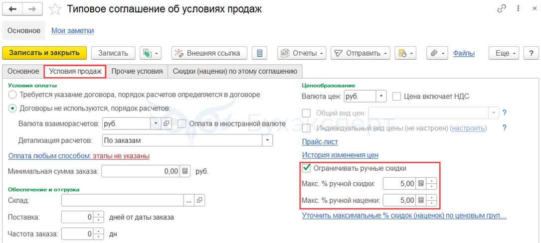 Для типовых соглашений перейдите в раздел CRM и маркетинг – Типовые соглашения с клиентами. На вкладке Условия продаж поставьте флажок Ограничивать ручные скидки и установите максимальные значения для скидок (наценок).