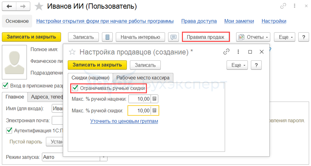 Ограничения ручных скидок в продажах по пользователям можно установить для каждого пользователя индивидуально. Перейдите в раздел НСИ и администрирование — Настройка пользователей и прав — Пользователи — Правила продаж, поставьте флажок Ограничивать ручные скидки и установите максимальные значения для скидок (наценок).