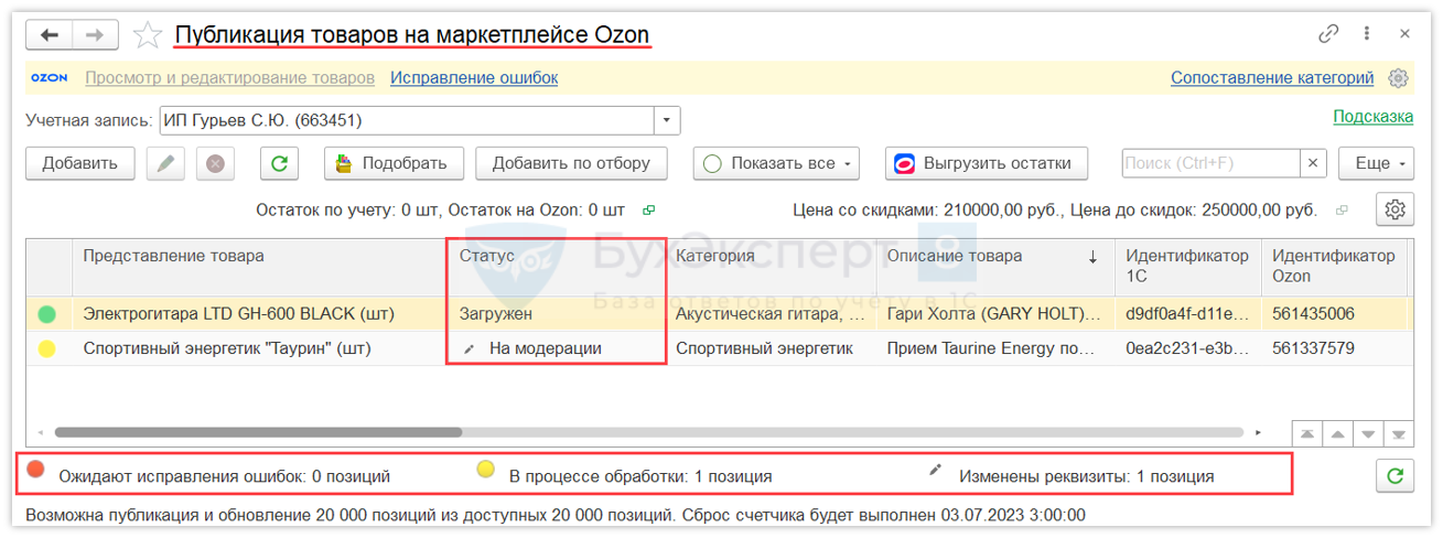 Обработка позволяет выполнять обмен и модерацию карточек товара OZON из одного окна: