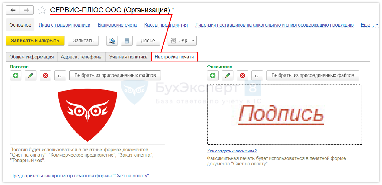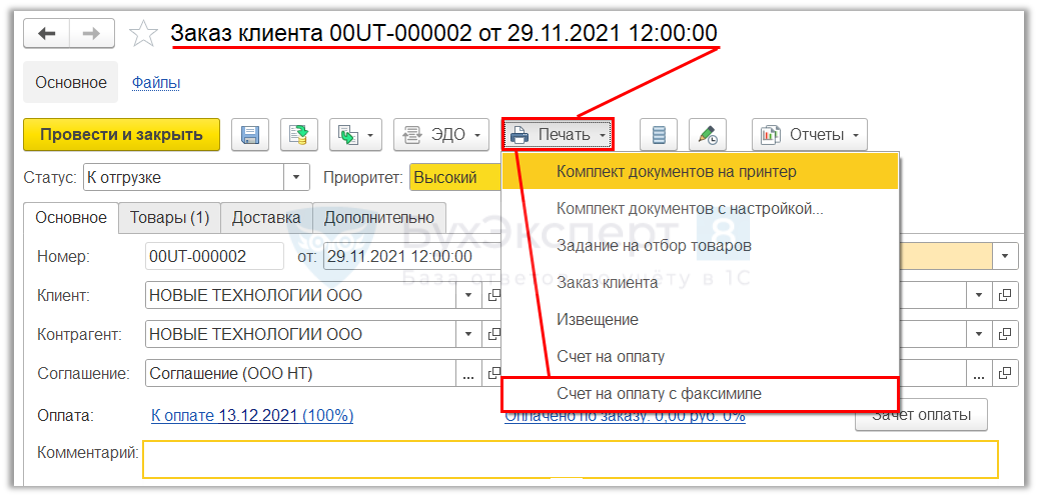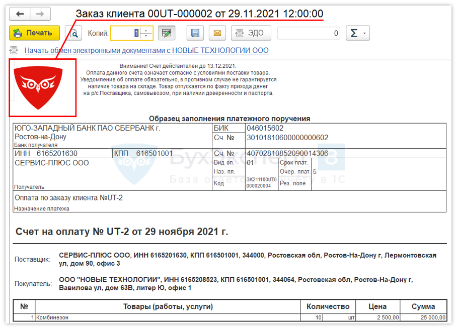 Настройка печатной формы Заказ клиента (Счет на оплату)